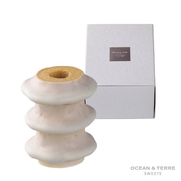 オーシャンテールスイーツ スノーショコラリングバーム|日本の自然の恵みをスイーツの世界へ、パティシエ独自の製法で作り上げられたスイーツコレクション「OCEAN&TERRE SWEETS」。コクと甘みの強い「那須御養卵」をふんだんに使い、一層一層丁寧に焼き上げました。バームクーヘンのリングが長く繋がります。雪化粧のようにホワイトチョコレートでコーティングされています。木が年輪を重ねていくように新郎新婦も末長く共に歳を重ねていけますようにという意味が込められています。