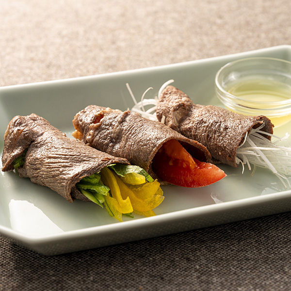 焼肉や煮込み料理として人気の高い「牛タン」を、しゃぶしゃぶに仕立てました。通常は輪切りにされることが多い牛たんですが、風味と食感が楽しめるタン先から、やわらかく適度な脂乗りと旨味の感じられるタン元まで、1枚の牛タンスライスで味わえるように、縦にスライスしています。この商品のために自社開発した、岡山県産久米南ゆず果汁を使用した「塩ぽん酢」をセットに。牛タンの旨味を更に引き立てる自信の塩ぽん酢です。焼きしゃぶでも美味しくお召し上がりになれます。