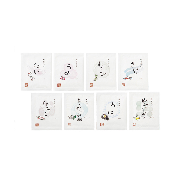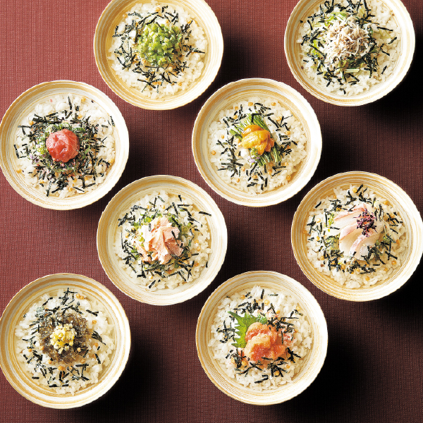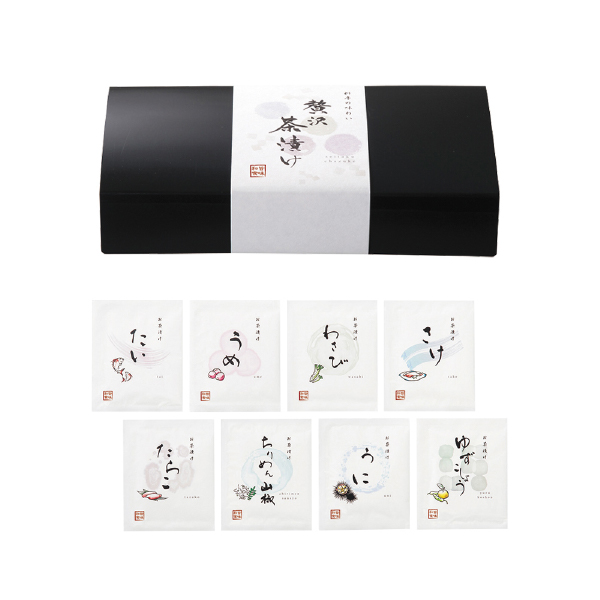 素材にこだわった贅沢な味わい。手の込んだ料理もいいけれど、シンプルに仕上げた料理でじっくり味を堪能しながら良き日に思いをはせる。縁起の良い「鯛」や「梅」。定番の「わさび」に「鮭」、「たらこ」、「ちりめん山椒」、ちょっぴり贅沢な「ふぐ」、「柚子胡椒」など8種類のお茶漬けを詰め合わせました。目上の方はもちろん、老若男女問わずお贈りいただけます。シンプルなお茶漬けで贅沢な時間を堪能してください。