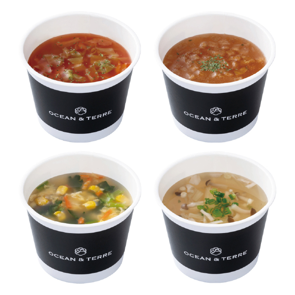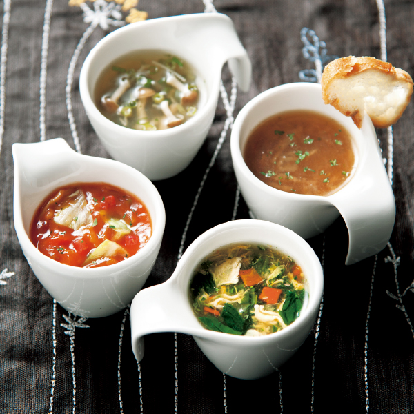 | 内容 | ザク切りキャベツとトマトのスープ×1、あめ色玉ねぎのスープ×1、野菜とたまごのスープ×1、しめじとえのきの和風スープ×1 |