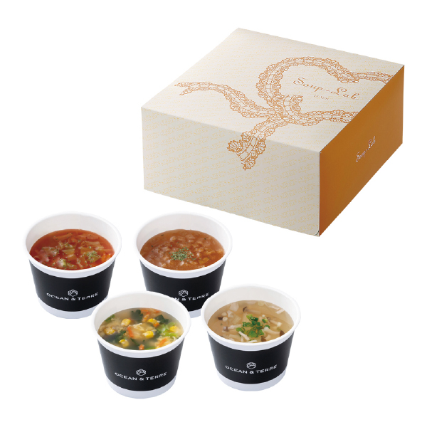 スープ・ラボ ベジタブル|いつもの食卓やお弁当に具だくさんのスープをもう一品。大切な人の健康にも気を配って、賢い食生活を。甘いものは苦手かも、と迷ったら健康的なスープの贈り物を選んでみてはいかがでしょう。お湯を注ぐだけで手軽に美味しい彩りが食卓に花を咲かせます。パック付きで洗い物を少なくて済むので、慌ただしい毎日にもぴったりです。リボンを掛けたような可愛らしいパッケージはお祝いやちょっとした手土産にも最適です。あたたまるひとときを、大切な方とお楽しみいただけます。