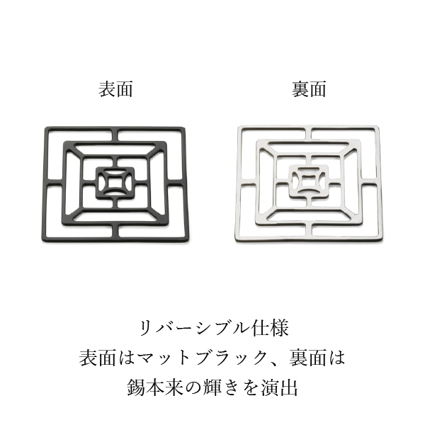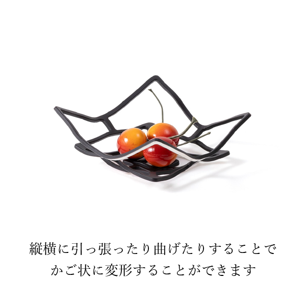 能作 KAGO - スクエア S - リバーシブルブラック|KAGOは、純度100%の錫が持つしなやかな特性を最大限に引き出した、能作ならではの逸品です。 一般的な錫製品には強度を補うために他金属を加えるのが通例ですが、KAGOは一切の混合をせず、あえて純錫のみで仕上げています。これにより、手の力だけで自在に曲げたり形を変えることができる、柔らかで上質な質感が生まれました。 お好みに合わせて、フルーツトレイや菓子器として優雅にアレンジしてお使いいただけます。陶磁器やガラス製の器と組み合わせれば、洗練された空間に一層の品格と趣を添えることでしょう。