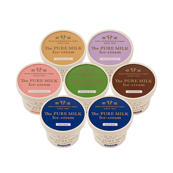 千本松牧場 ピュアミルクアイス7個入|那須高原の豊かな自然に育まれた新鮮な牛乳を贅沢に使用した、千本松牧場自慢のピュアミルクアイスクリームセットです。 コク深い「リッチミルク」をはじめ、風味豊かな「抹茶ミルク」や「カカオミルク」、果実の爽やかさが広がる「ストロベリーミルク」「ブルーベリーミルク」、香ばしい「キャラメルミルク」など、バラエティ豊かな7個入り。 素材の良さを活かしたやさしい甘さと、なめらかな口どけが特徴です。ご家族やご友人への贈り物としてはもちろん、自分へのご褒美にもおすすめです。