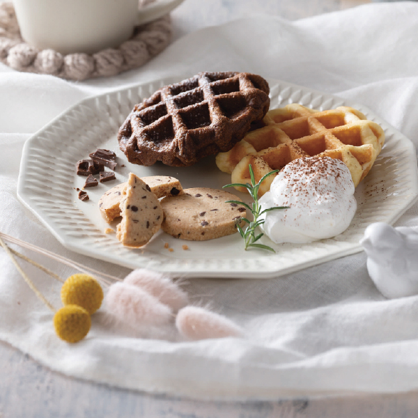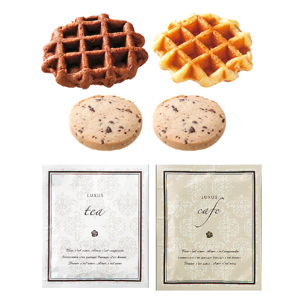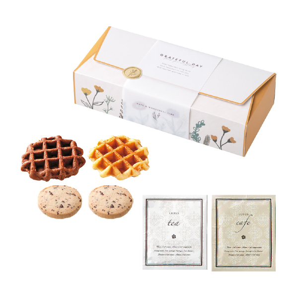 | 内容 | プレーンワッフル×1、ココアワッフル×1、チョコチップクッキー×2、ドリップ珈琲8g×1、三角ティーメッシュ(ダージリン)2g×1 |
